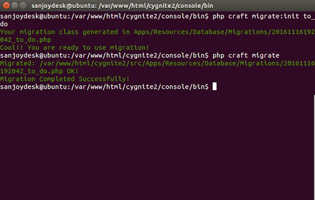 You don't have to do much stuff as Craft commands are ready to generate most of the stuffs for you. Open the console window and from the root directory of your project, go to /var/www/cygnite/console/bin/ directory and issue below command.